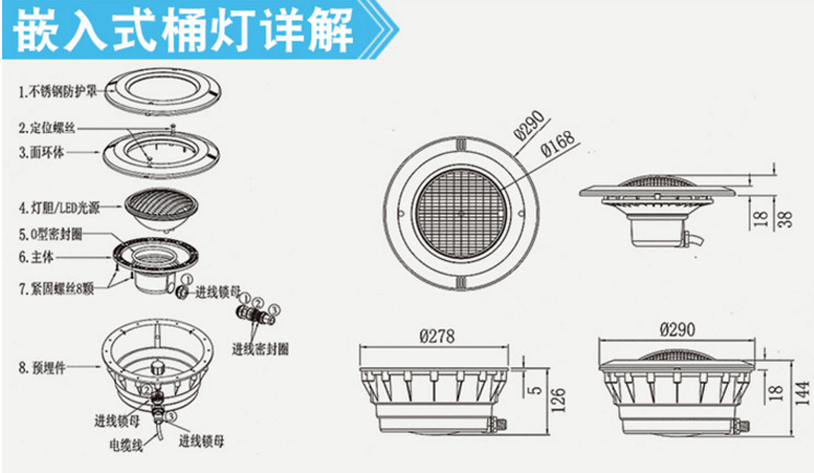 - 嵌入式泳池灯安装于墙体里面,需要在墙上打孔。Par56光源已经做好防水,并且Par56光源有多种可选。